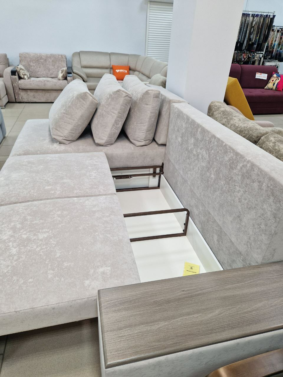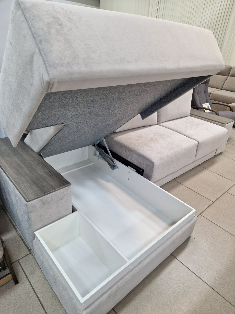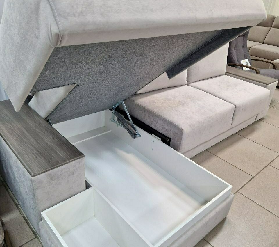 Особенности: ящик для белья, подлокотники, подушки